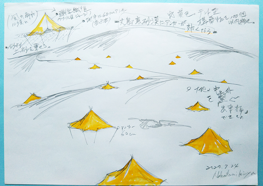 島の自然と発生する環境を内、inとし。島から見た海と列なる島、半島を外、outと。 当たり前の見方から、始めて、裏砂漠の厳しい環境に刺激を受け、創造しています。