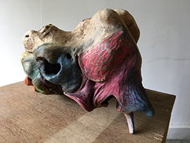 materials. Sculpting by direct carving, I try to establish a relationship between mental images and the sculpted matter. The skin, the bones, the organs represent a place where I can modify space, change the points of view, weave links, combine the inside and the outside as a whole. I tend to mix and push the limits of figuration to question what I think I know, starting from existing materials that already have a form, from a past existence. Like a subjectivity that spilts up and finds an alterity in a volume, allowing it to inhabit a place and a space. It is also a way to find an inking through sculpture that make visible and palpable a trace, a memory, a reminiscence.